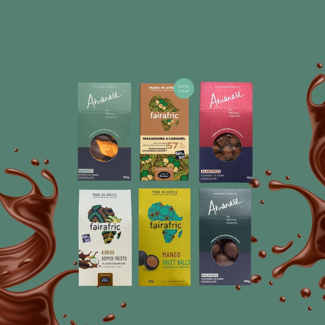Wrap the season in joy with our limited-edition fairafric Christmas Package. Package includes: Premium fairafric Chocolate, Snack Boxes and Optional Handmade Pralines.